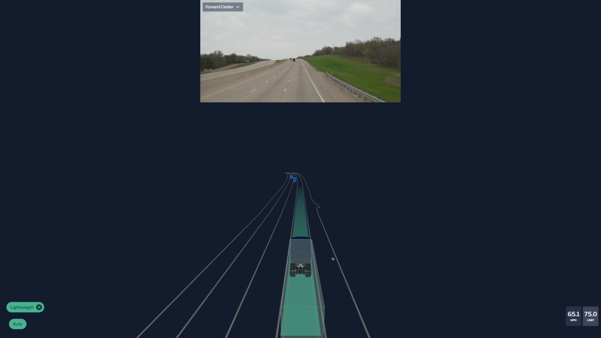 In this video, the Aurora Driver encounters a ladder in the road—a large object that could potentially damage our truck or other vehicles. The Aurora Driver detects the ladder from over 150 meters away and proactively maneuvers to avoid it, behaving the same way a trained commercial driver would have handled this scenario.